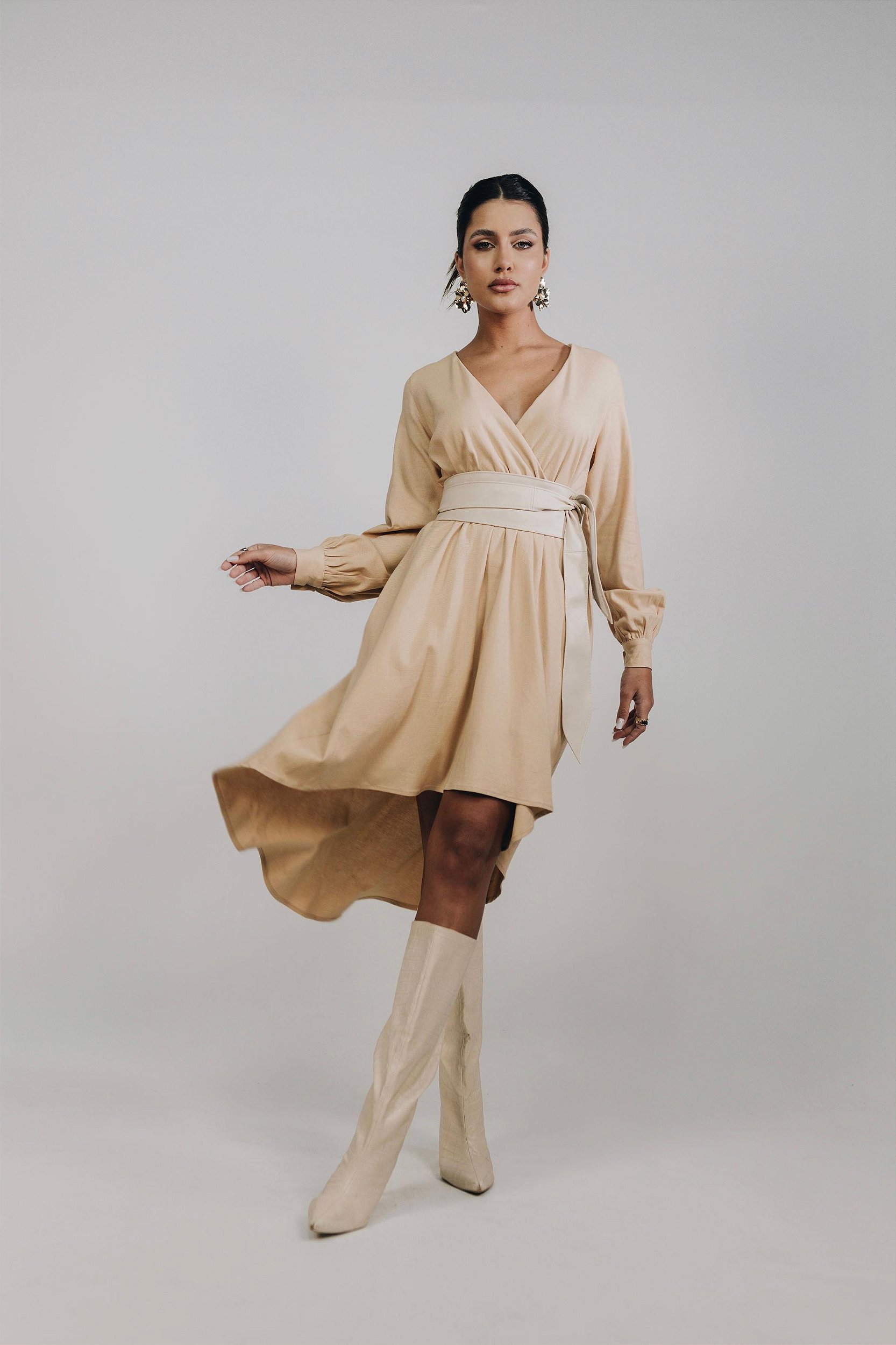 A saia com caimento solto e movimento, levemente mais curta na frente, traz modernidade e leveza ao visual. As mangas longas com punhos delicadamente ajustados completam o design com um toque refinado, tornando a peça perfeita tanto para produções diurnas quanto para ocasiões especiais com styling adequado.
