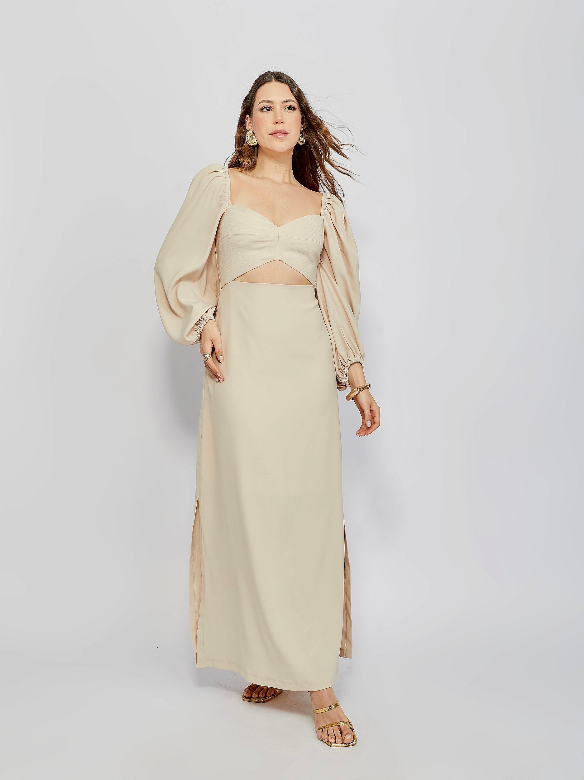 Vestido Longo em Seda com Recortes e Mangas Bufantes